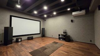こんにちは。ホームシアター工房名古屋の加藤です。今回は防音室シアターのご紹介です。120インチのパネルスクリーンと7.1.4chの本格シアターとなっております。防音室は㈱リブテック様施工です。